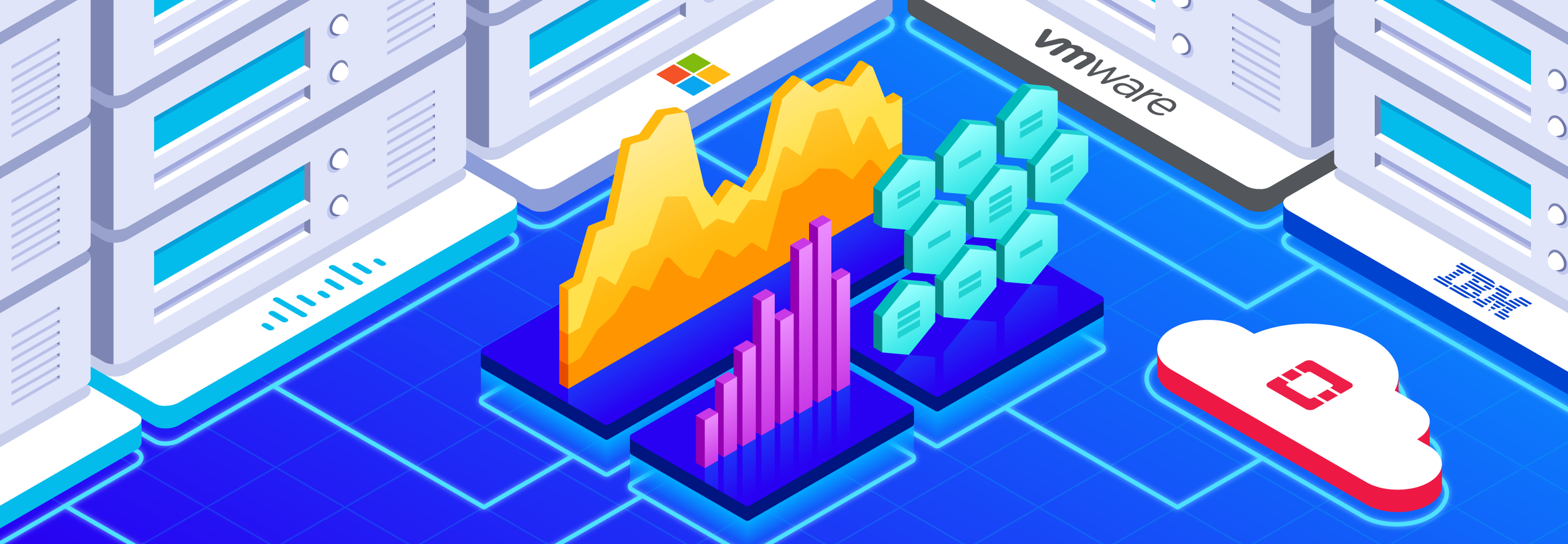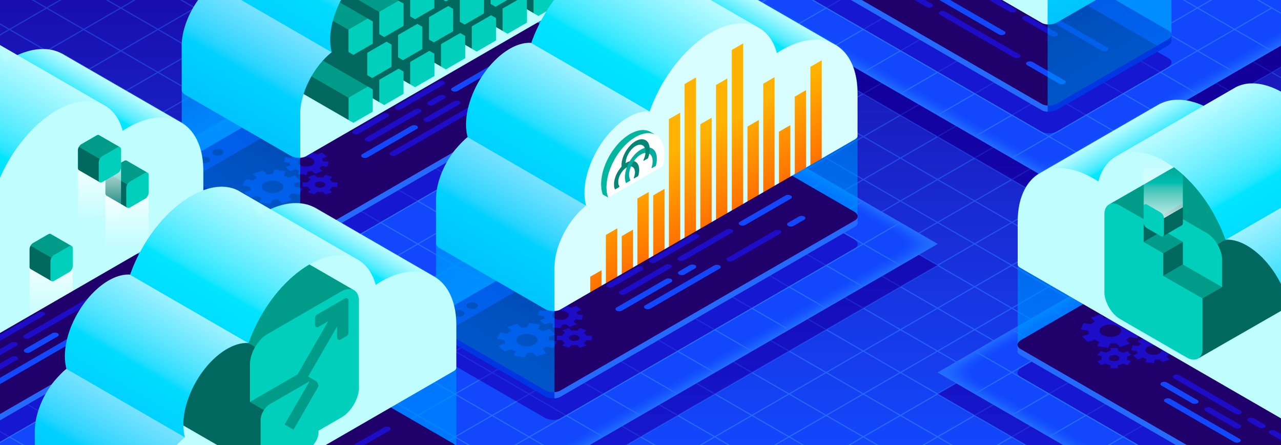 Hero illustrations for Datadog’s Solutions landing pages, focused on providing monitoring solutions for various use-cases and technologies.